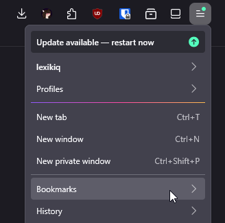 - Navigate to Bookmarks then Manage bookmarks