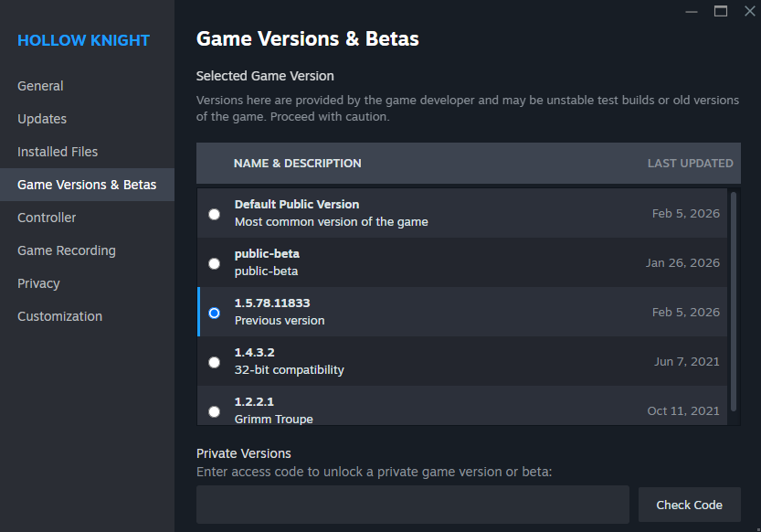 - Steam: right click Hollow Knight > Properties > Installed Files > Verify